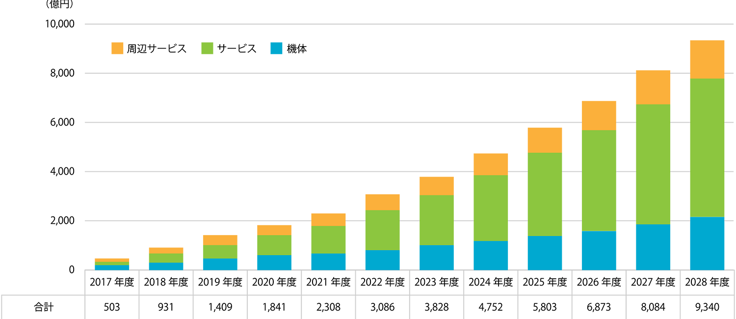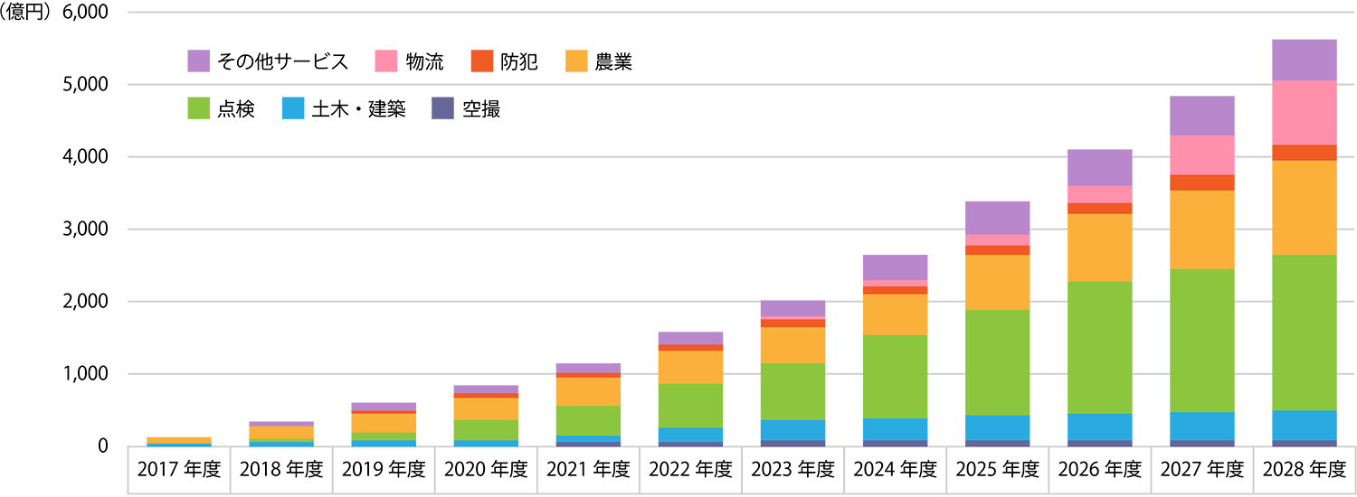日本国内のドローンビジネスの市場規模は2028年度には9,000億円に達すると見込まれています。